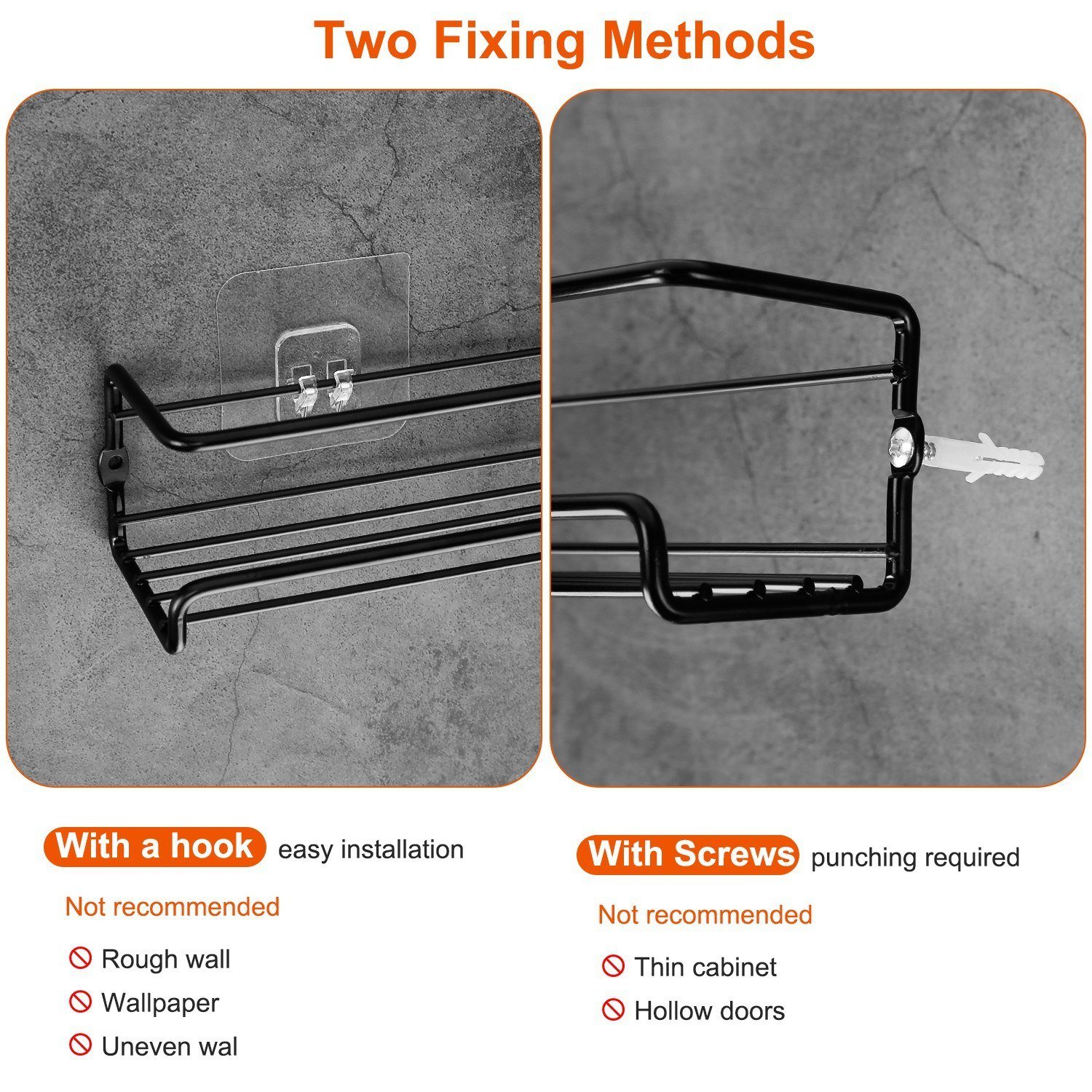 *Easy To Install*:Two installation methods for your choice. You can stick the hooks on the wall to hold the rack; traceless and more convenient. For firmer installation; use the screws to fix the rack. It can be applied to most surfaces. However; uneven surface; wallpaper; thin cabinet; and hollow doors are not suggested.