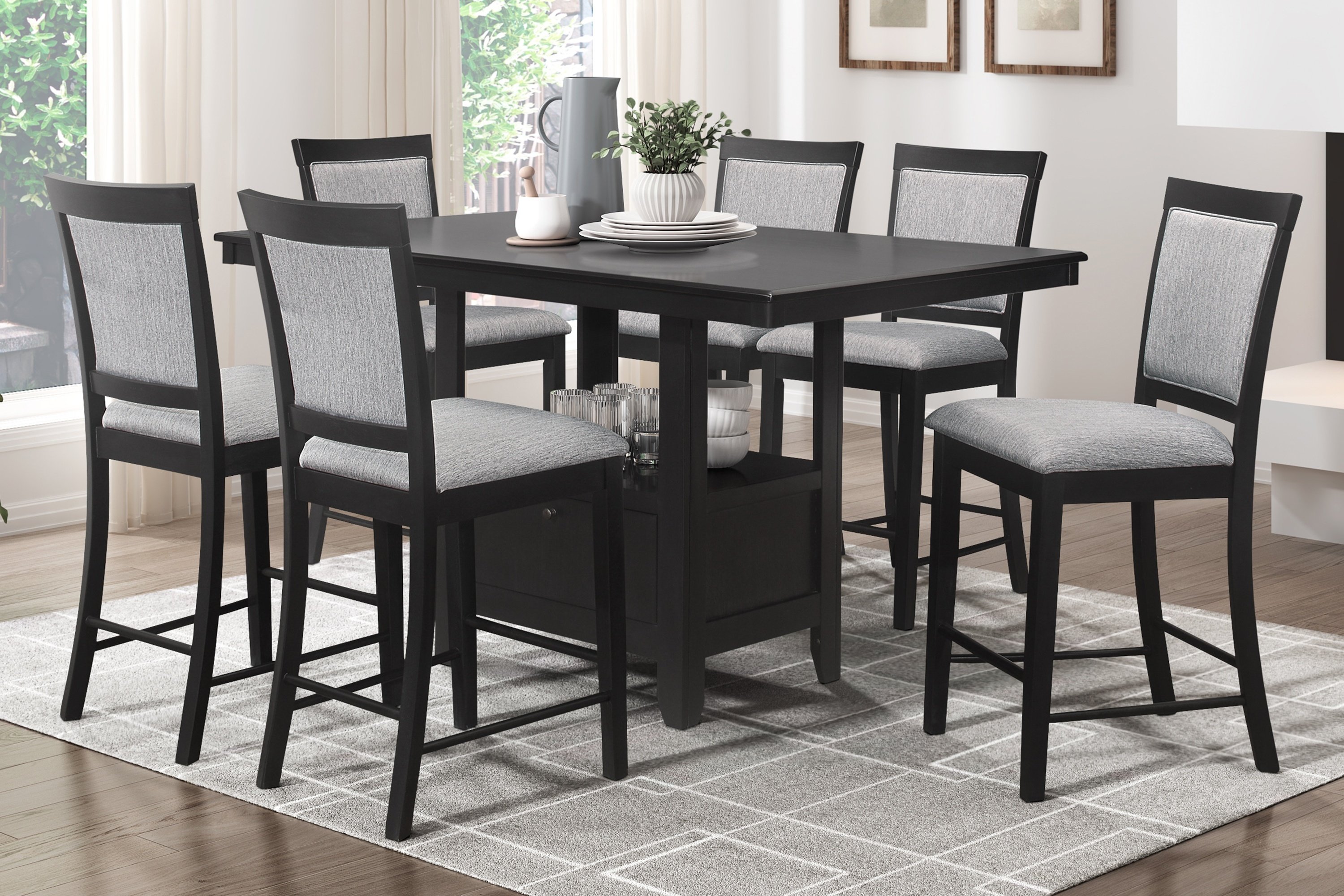 The Raven Collection combines stylistic versatility and functional storage for the ultimate space-saving addition to your casual dining space. The storage base of the table allows for convenient access to your tabletop accessories. A charcoal-hued finish, over mindy veneer, serves as a striking canvas that lends to the versatile look of the collection's overall design. Coordinating wood-framed counter-height chairs feature gray upholstered seats and backs.PRODUCT DIMENSIONS: COUNTER HEIGHT TABLE: 40" x 62" x 36"HApron to floor: 33"Distance between legs from the shorter side: 14"Distance between legs from the longer side: 22.5"Shelf interior: 27.5" x 19.5" x 17.5"(1/Upper); 26" x 18" x 8.5"(1/Bottom)COUNTER HEIGHT CHAIR: 19.5" x 22.5" x 42.5"HSeat Width: 19.5"Seat Depth: 18"Seat Height: 26"Listing Includes: 5pc Dining Set (1 Counter Height Table and 4 Counter Height Chairs) Only.Simple Assembly Require.