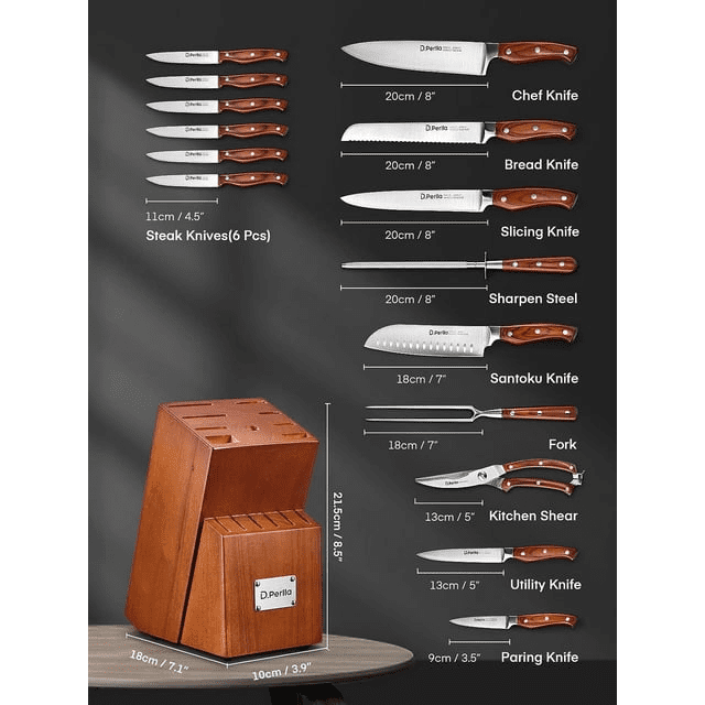 D.Perlla knife set, high carbon stainless steel premium kitchen knife set with wooden block 16pcs, super sharp cutlery knife with carving fork and serrated steak knives. The d.Perlla kitchen knives are characterized by high quality forged blades, which are made of high hardness martensitic stainless steel. The rust resistance is high and the cutting characteristics are perfect.