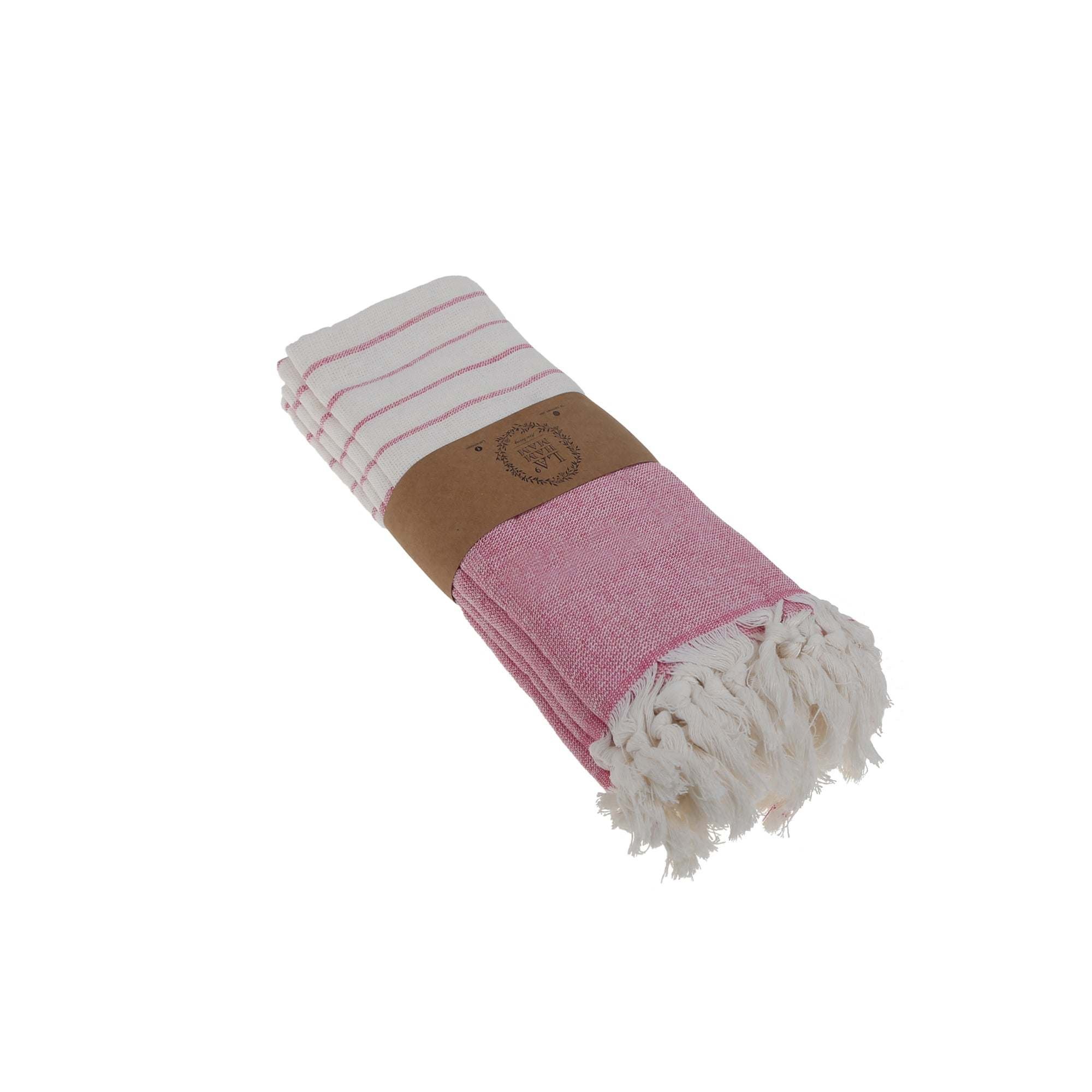 Enjoy La'Hammam's unique cotton Turkish peshtemal hand or kitchen towels for your everyday use, in the kitchen or as your go-to hand towel. These cotton towels can also be used as placemats, for cooking, as a hand towel, dish towel, kitchen towel, hair towel, face towel and gym towel. Available in white and stripes with an accent color of your choice and handmade white fringes.