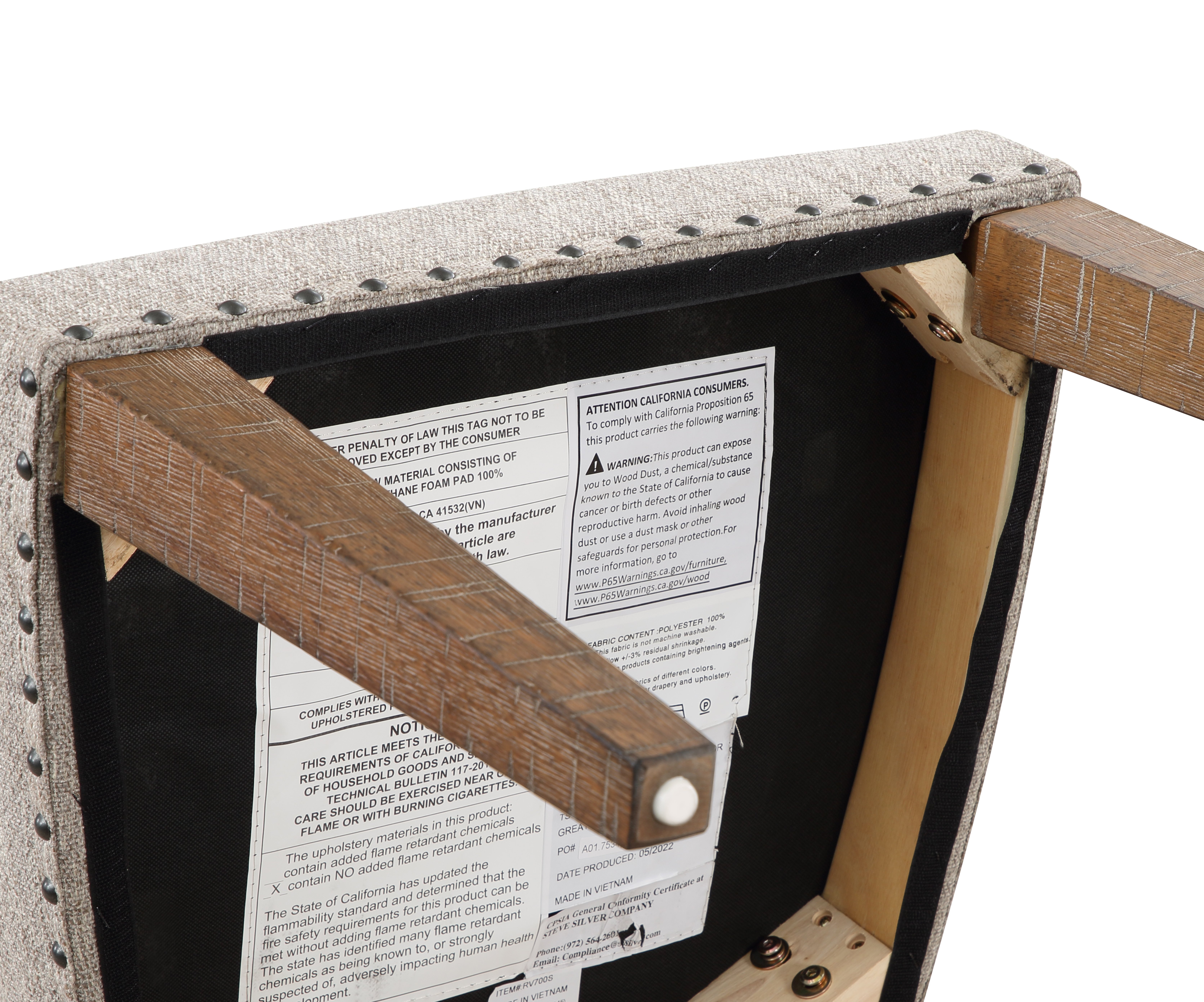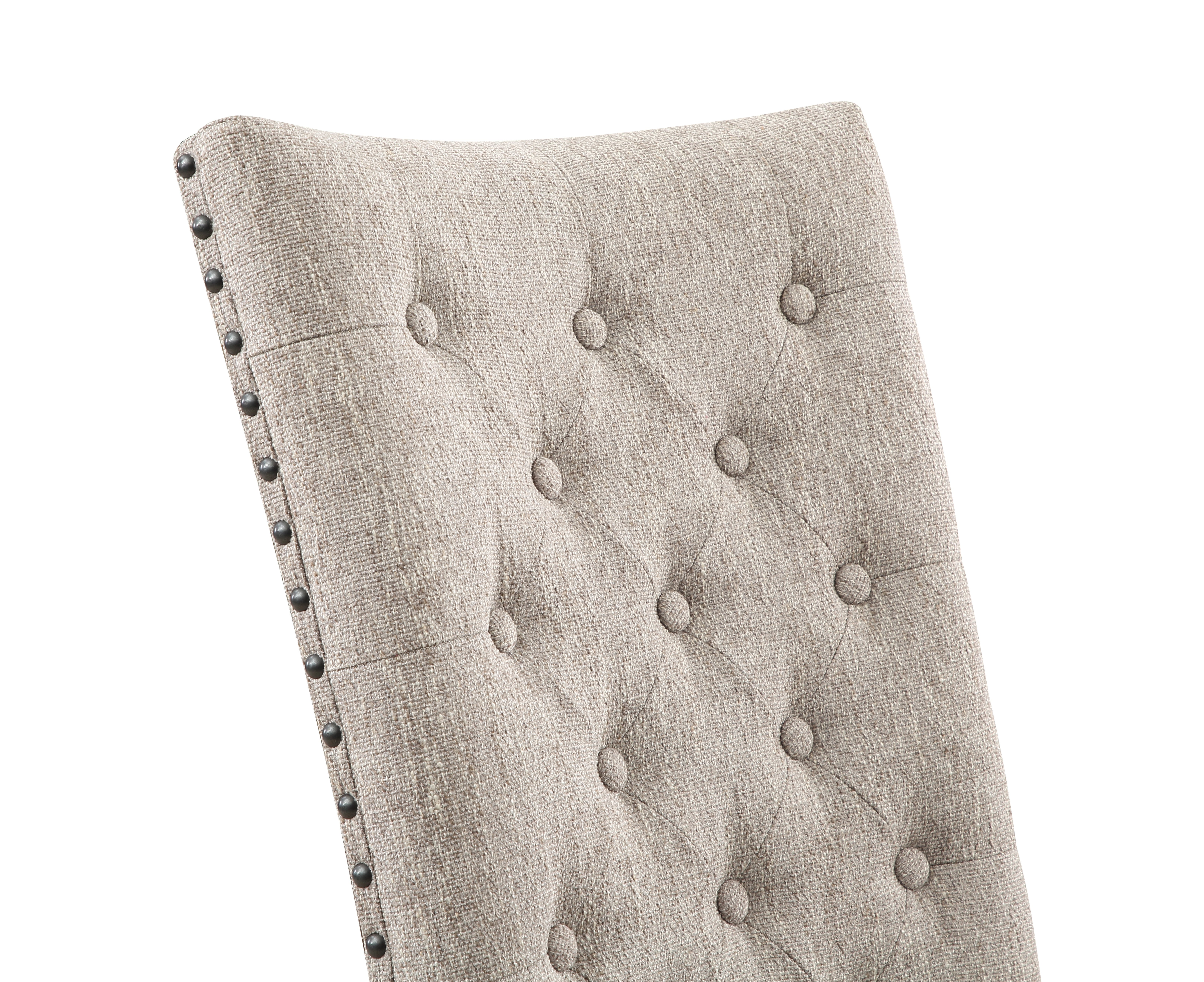 Button-tufted canvas dining chair with oil-rubbed dark bronze nailhead trim and wood-rimmed back is as gorgeous at or away from the table