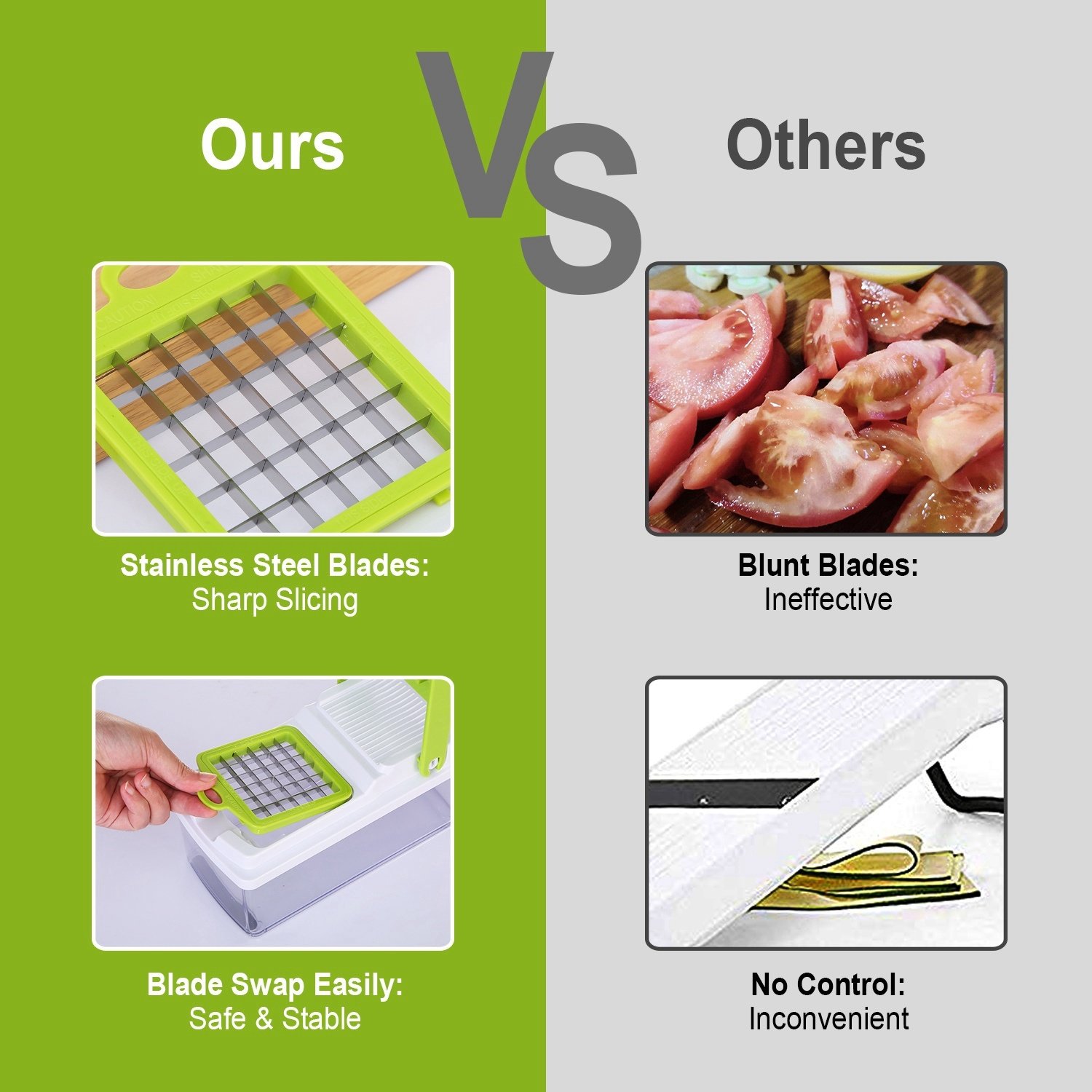 *NO MESS & NO HURT*:Equipped with catch tray to hold vegetable dices without worrying about food mess on kitchen counter. With our vegetable slicer; no more worry of accident hurt by kitchen knife when cutting in traditional way.