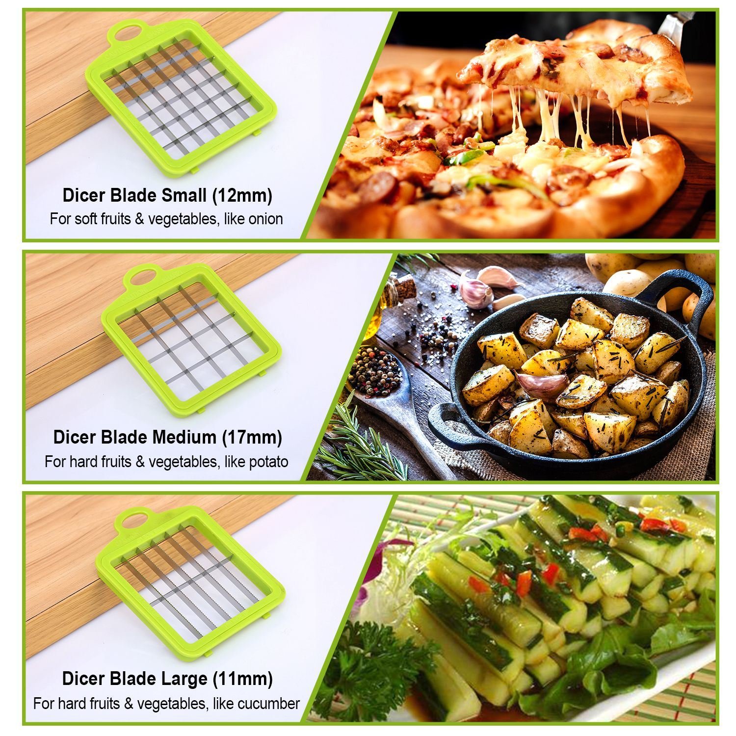 *3 IN 1 MULTIFUNCTION BLADES*:Come with 3 interchangeable dicer blades; which make it much easier to get different size food dices in even shape as you need. It's an amazing kitchen helper to cut prep time in half. Save time and energy!
