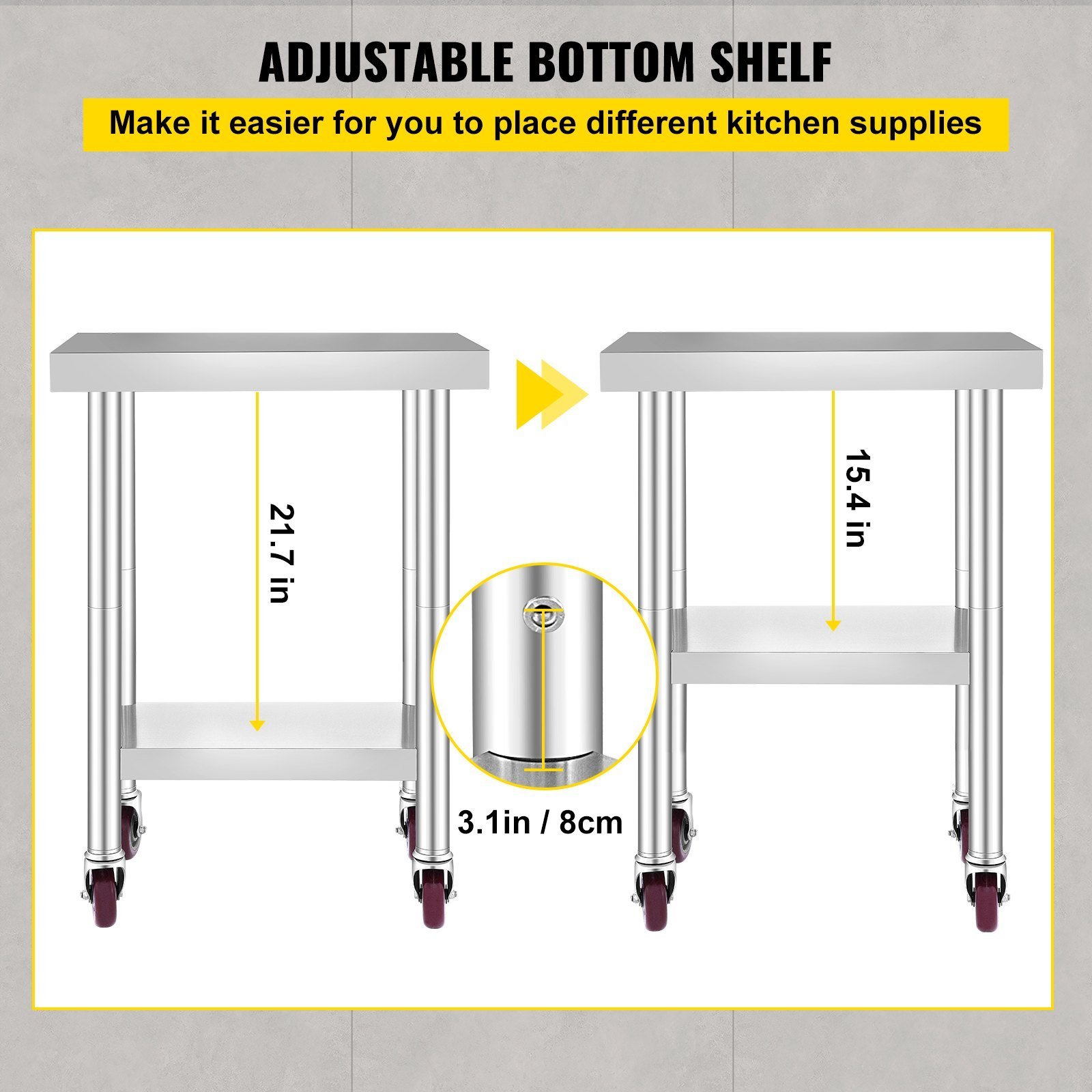 4.Adjustable Undershelf: Since the stainless steel work table's lower shelf is flexible, you can raise or lower it to accommodate the size of the items you need to store. The shelf sets have 3 levels of height (the distances between 2 shelves: 15.4-18.5-21.7 in) to fit your needs. The larger storage space is favorable for you to organize your frequently used cooking items well.